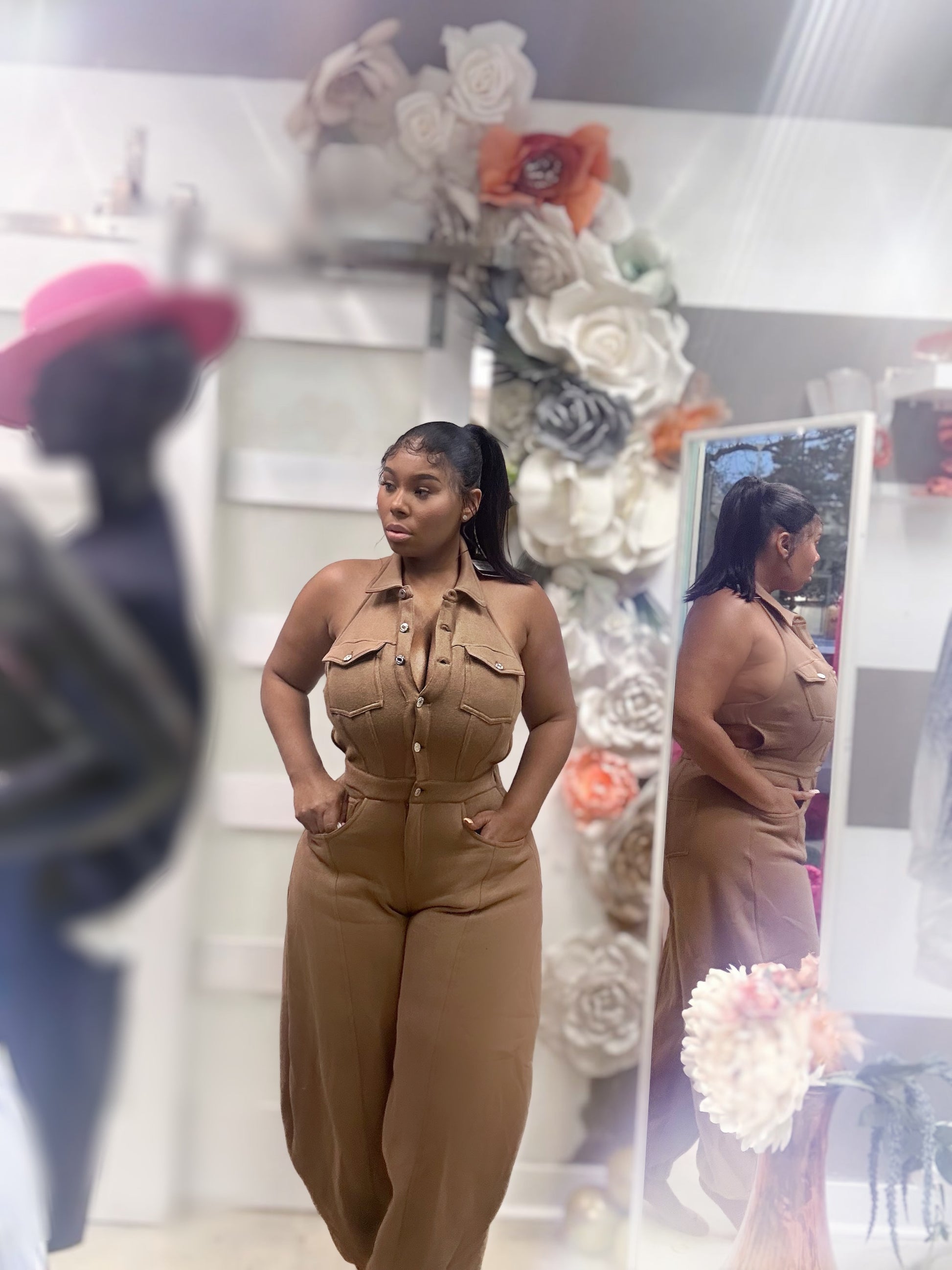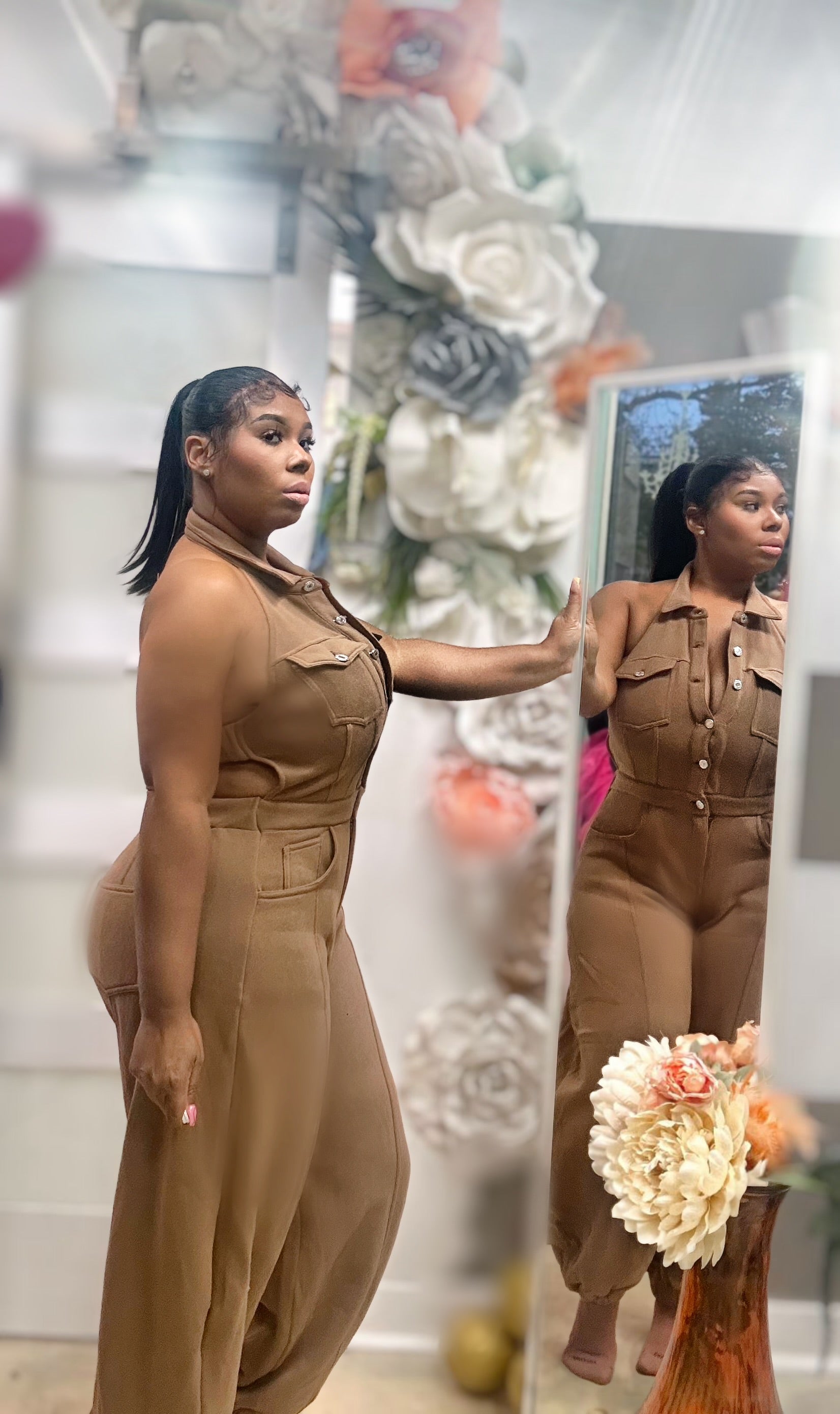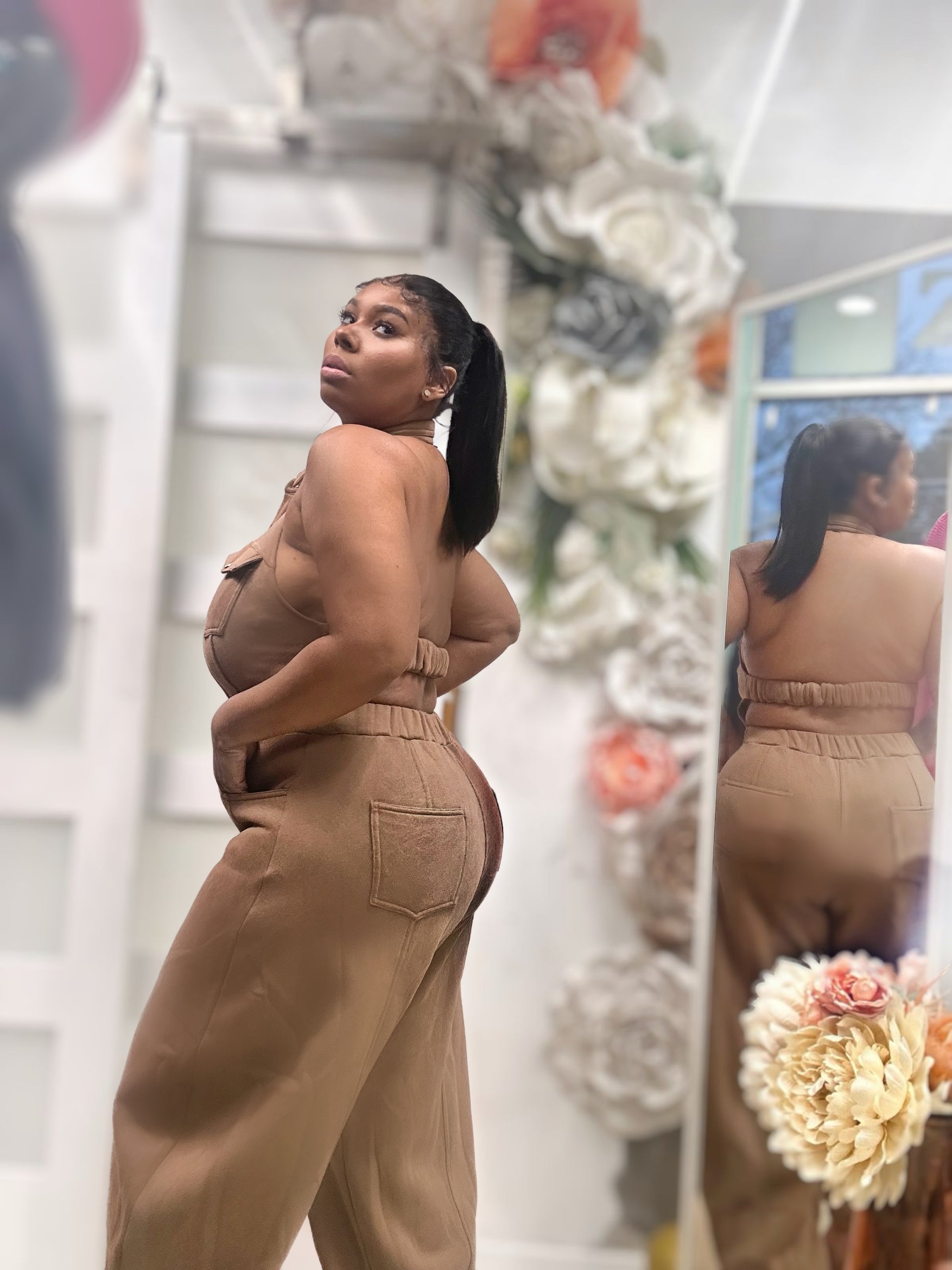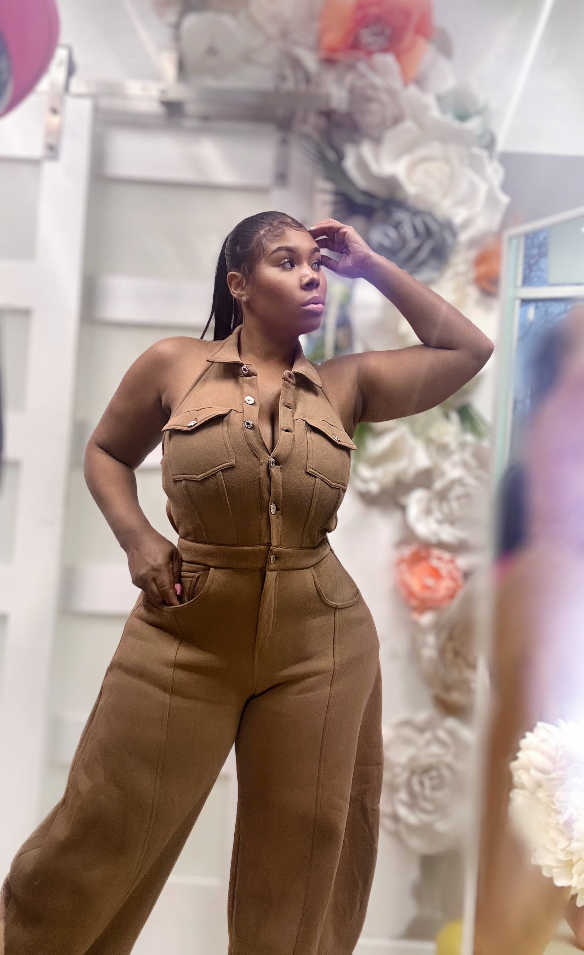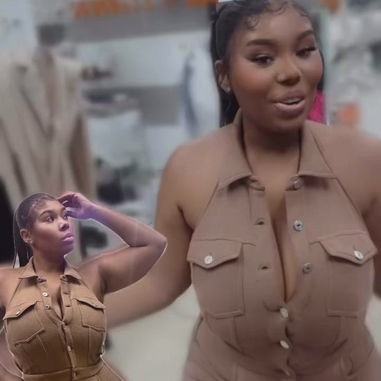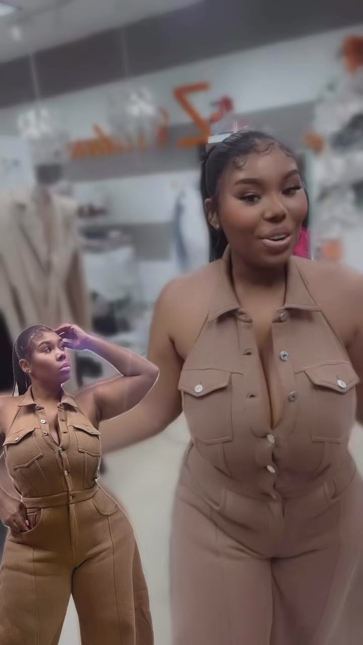 Elevate your wardrobe with Zcouture's Latte Brown Halter Jumper! This blackless jumper features a button closure and a barrow pants leg. Made with soft, comfortable sweatshirt material, it's not your ordinary sweats. Dress it up with a pair of funky heels or keep it casual with a comfortable shoe for runs on the go. A must-have for the fall season!