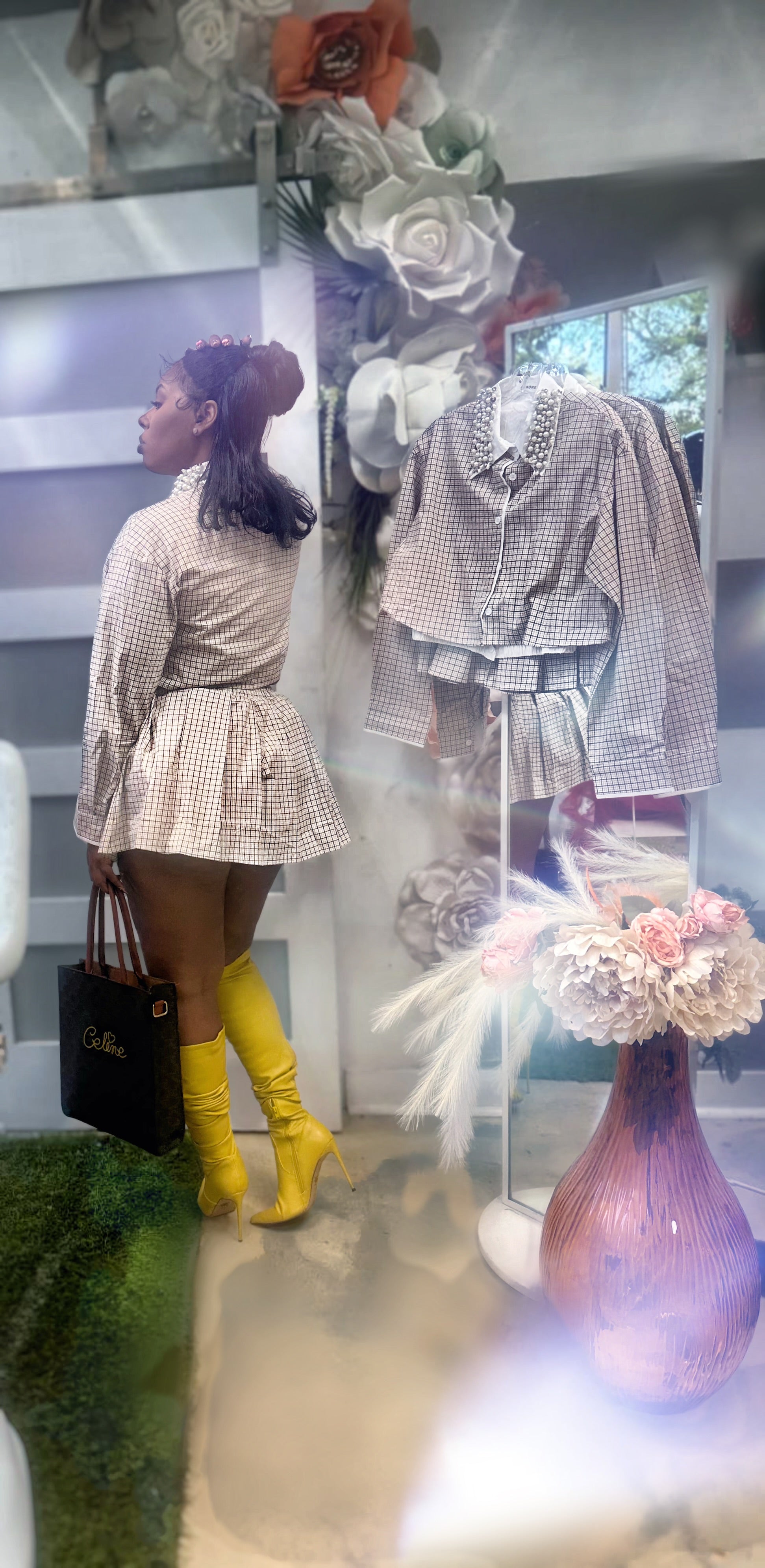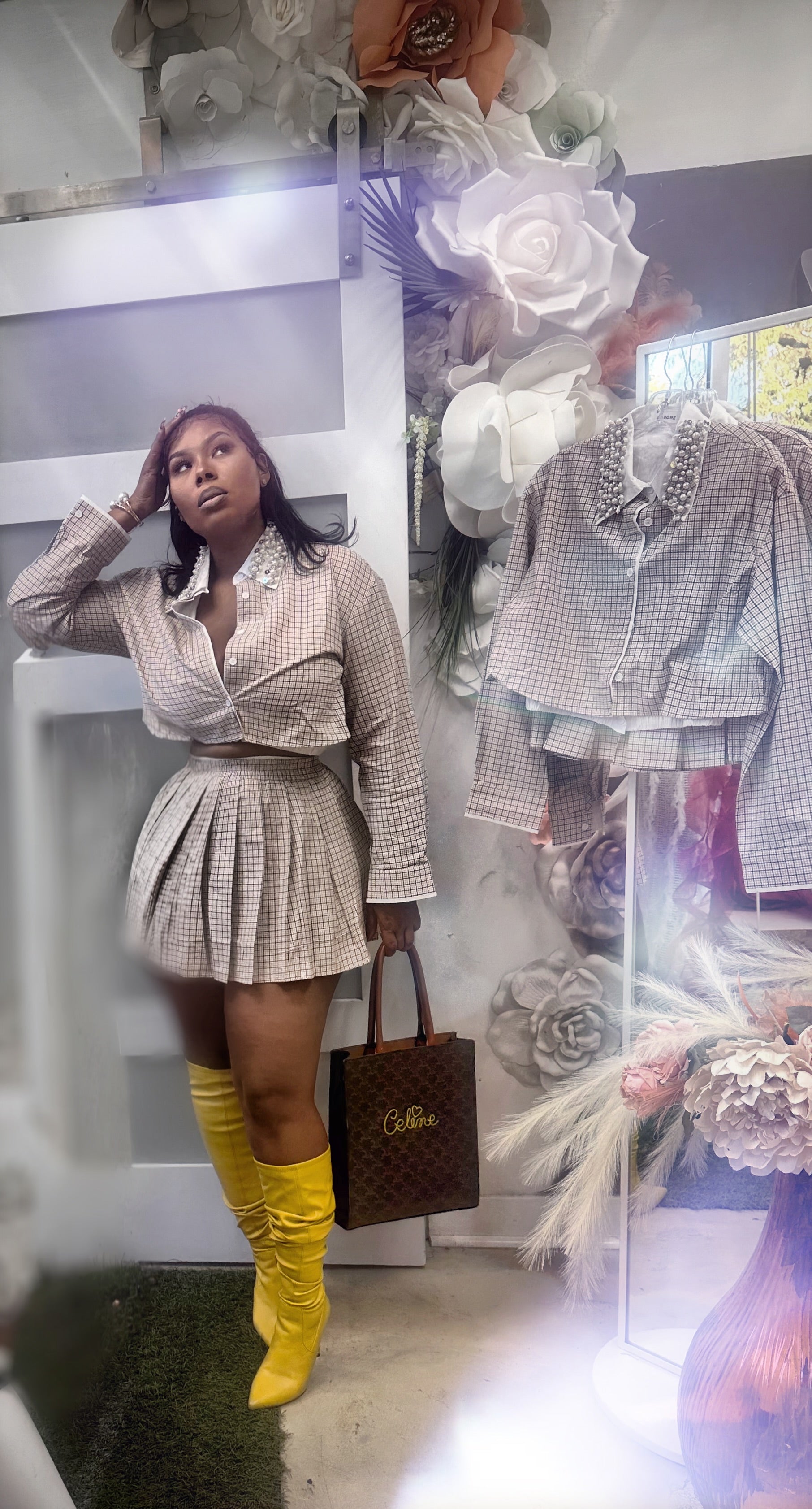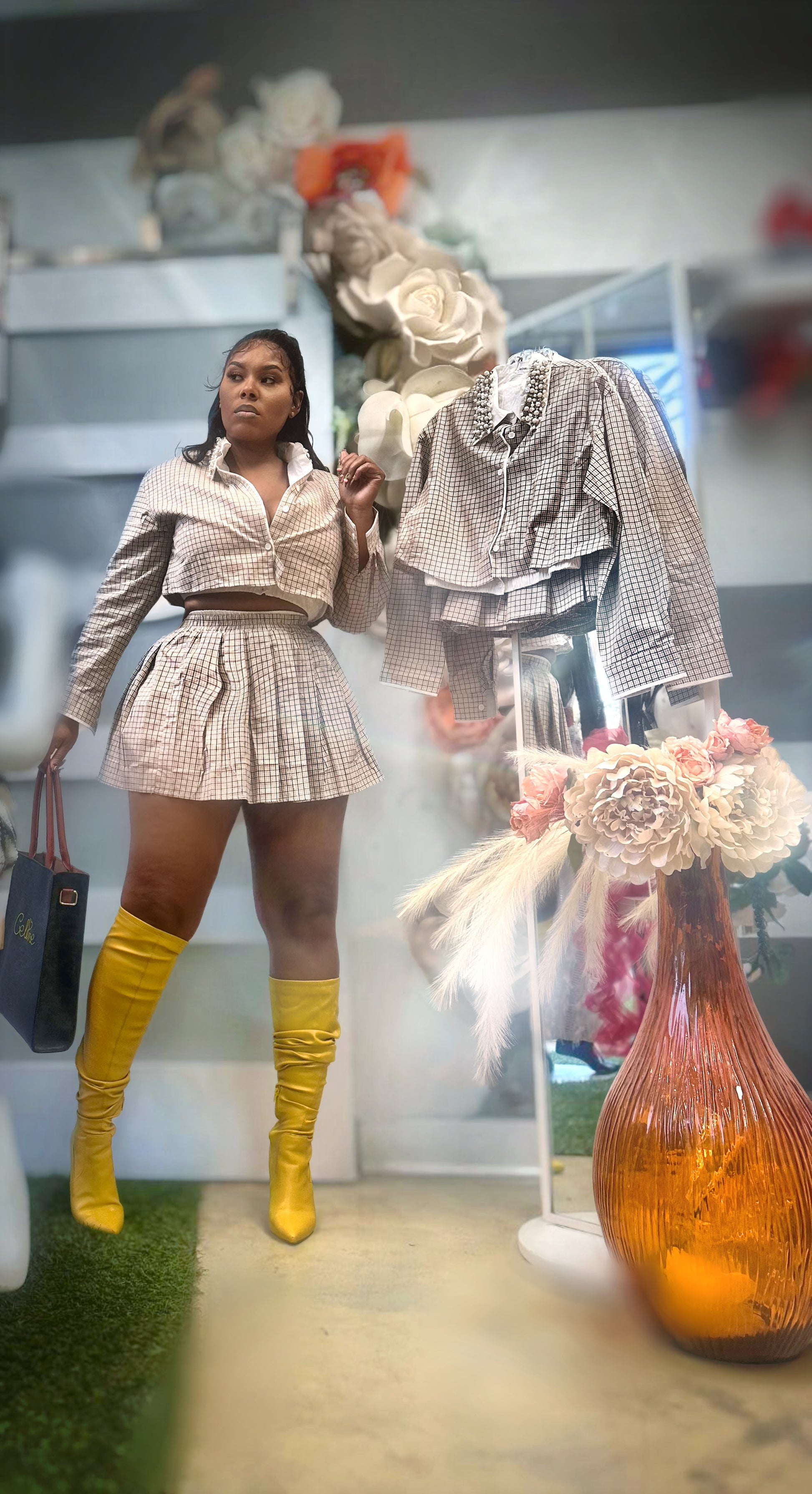 Keep your wardrobe stylish and versatile with this plaid nude and brown pleated skirt. Its matching crop button up adds an extra level of fashion-forward flair. Perfect for fall, this essential piece can be paired with a thigh high boot or a nice pair of kicks. Don't miss out on this trendy addition to your closet.